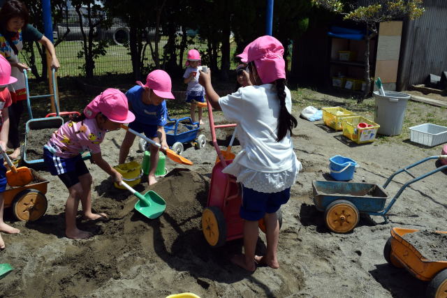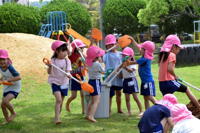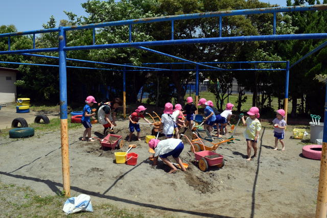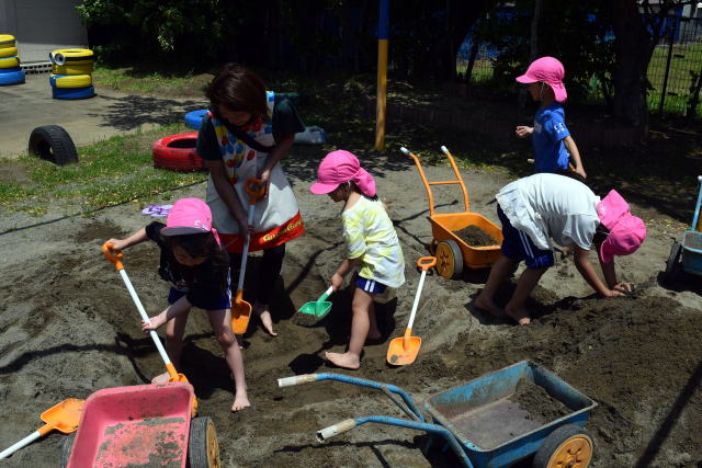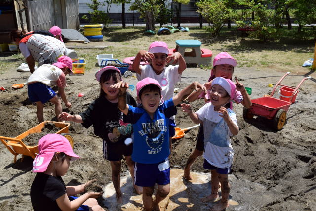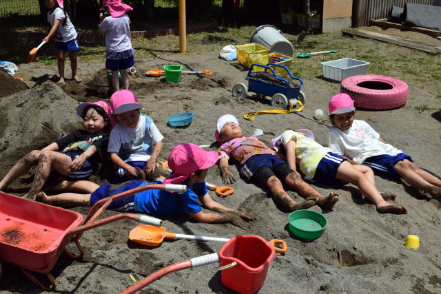 幼児の砂遊びには、手先の器用さ、体幹やバランス感覚など 様々な発達を促す効果があります。 また、友達と道具を共有したり、順番を守ったり、協力したりする中で 社会性を身につけることができます。 実は砂遊びって「最強」なんです! これからもたくさん砂遊びをします。 お母さん、お洗濯、よろしくお願いします!!! |