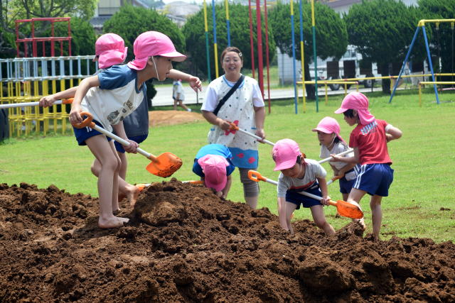 「ここにはおおきな穴を掘ろう!」 お風呂かな?海かな? 子ども達のイメージはどんどん広がります。 |