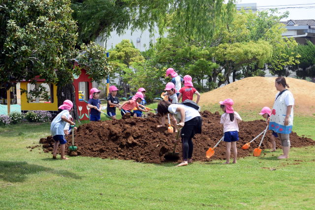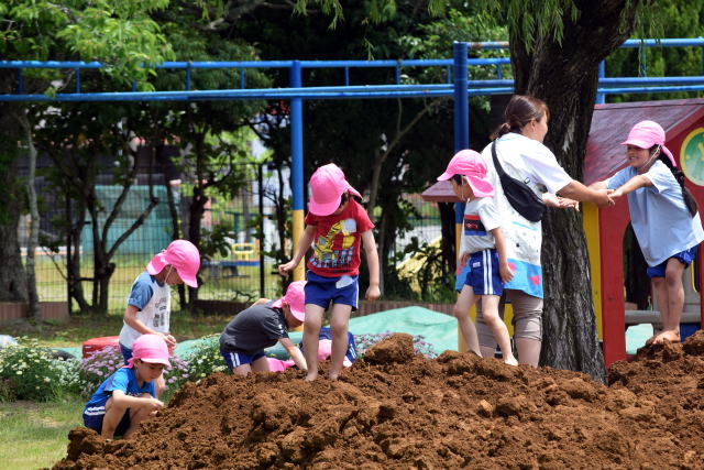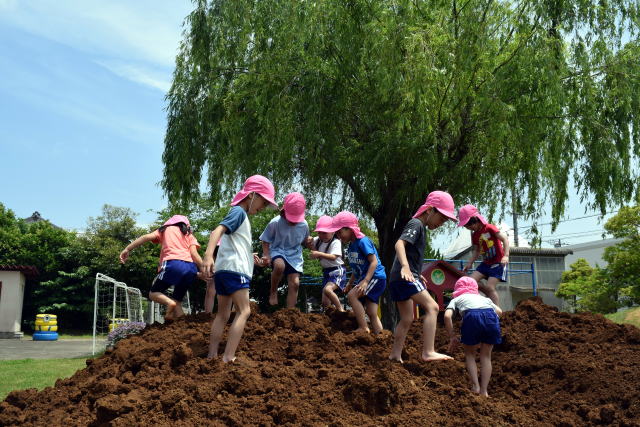 今年も新しい土がたくさんきました。 裸足で歩いたらどんな感じがするかな? 「ヒヤッと冷たくて気持ちいい!」「ゴロゴロして歩きにくーい!」 「柔らかいところと固いところがあるよ」「足がもぐっていく〜」 色んな声が聞こえてきました。 |