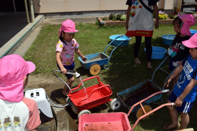 「水を運ぶぞー!!」「次は僕にホースを貸してね!」 |