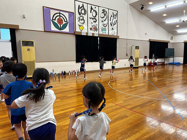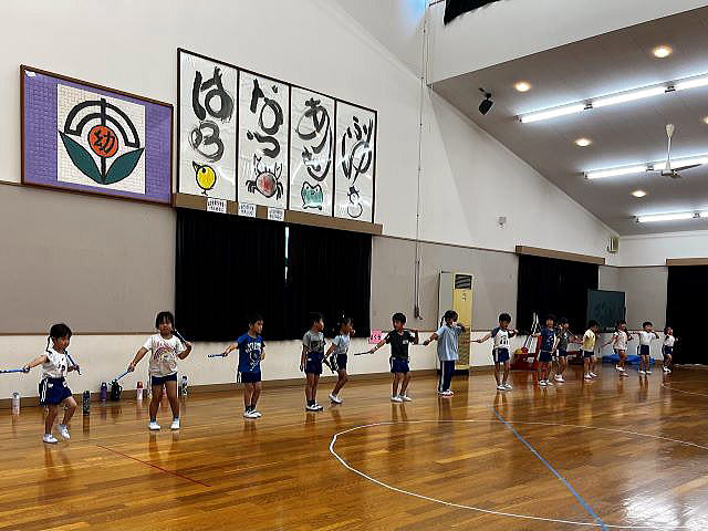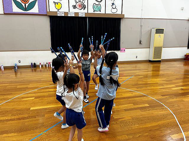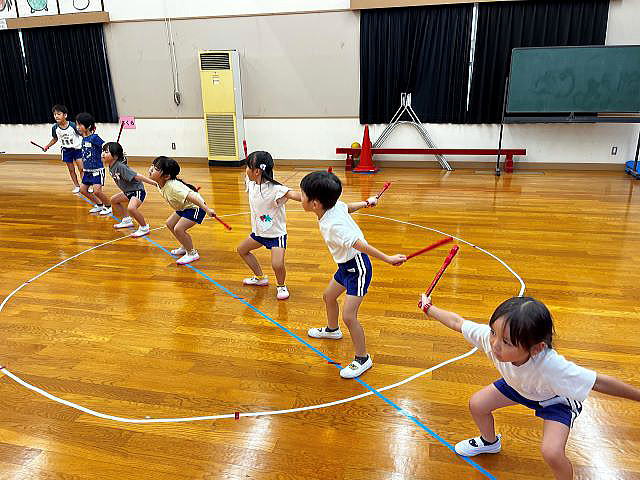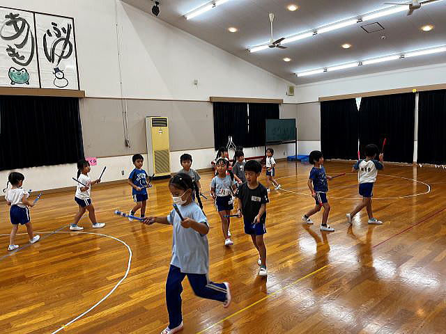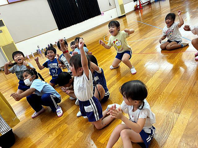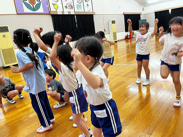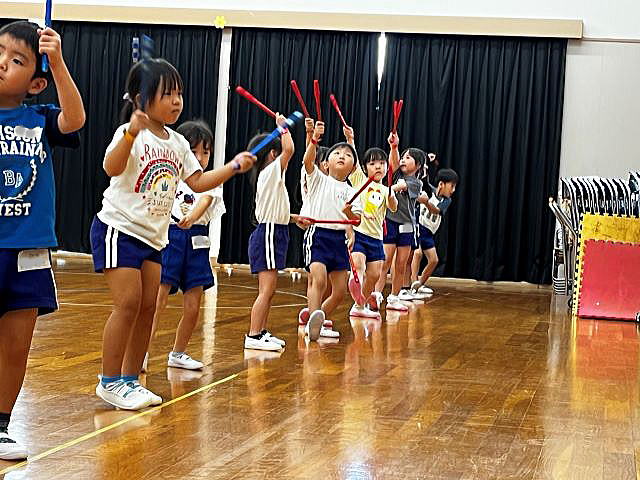 年長さんになったので、ちょっとカッコイイ選曲♪ 振りももちろん、年長さんらしくカッコよくレベルアップしています。 「みーぎ!」「ひだり!」「ひらいてとじる!」 練習の声が響いています。 |