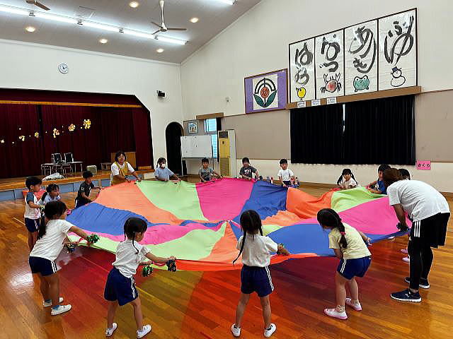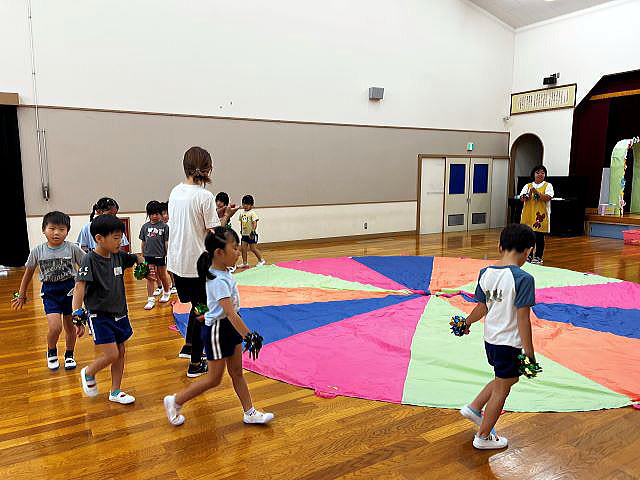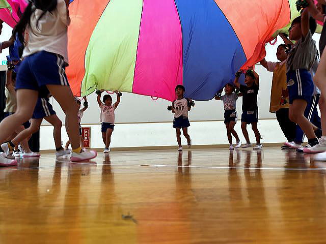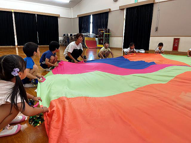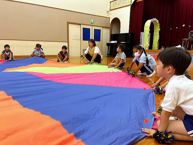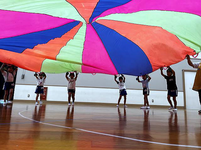ひとり一人が、しっかりと持って、しっかりと引っ張って・・・ 「みんなで力を合わせる」「みんなの気持ちを一つにする」・・・ 5歳児なりに一生懸命、バルーンを通して、感じて、考えています。 成功したときの喜びを、先生とみんなで分かち合っています。 |