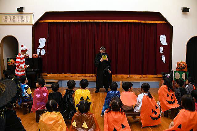 パーティーが始まりました!!! 今日は市内のALTの先生が11人も!中川幼稚園に来てくれました! はじめにお名前とコスチュームの説明をしてくれました。 それから、根形保育所の年長さんも遊びに来てくれました。 今日は1日よろしくお願いします。 |