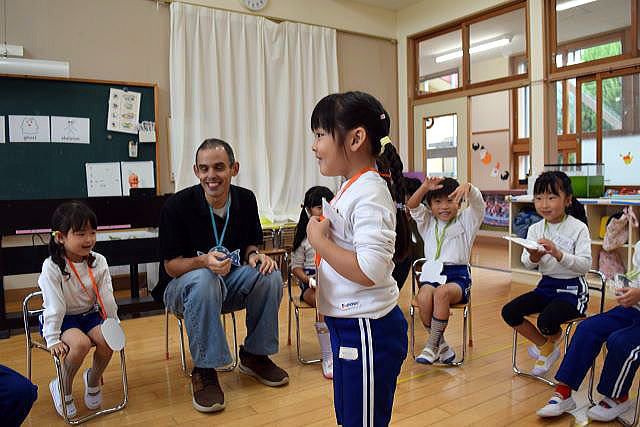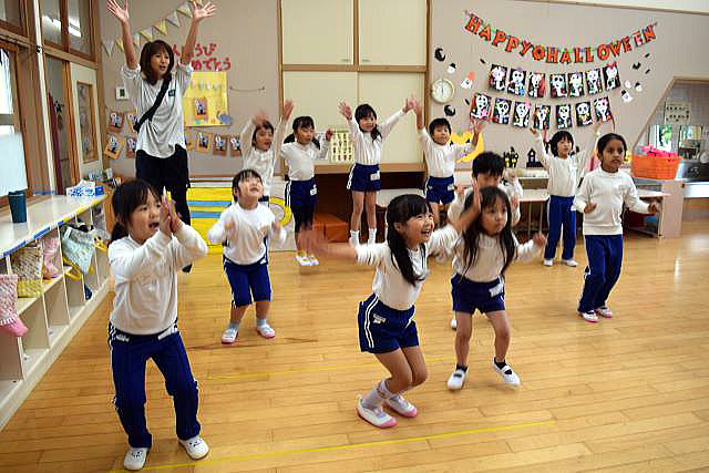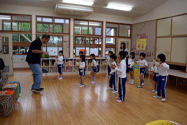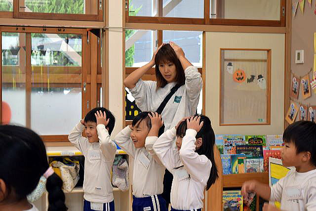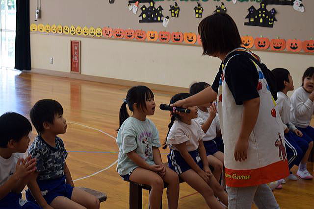 「英語で遊ぼう」 みんなALTの先生を一生懸命真似しています。 今日はハロウィンにちなんだ単語を教わりました。 英語って楽しいね♪ |