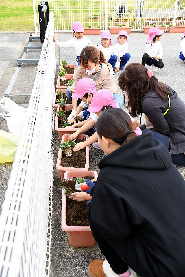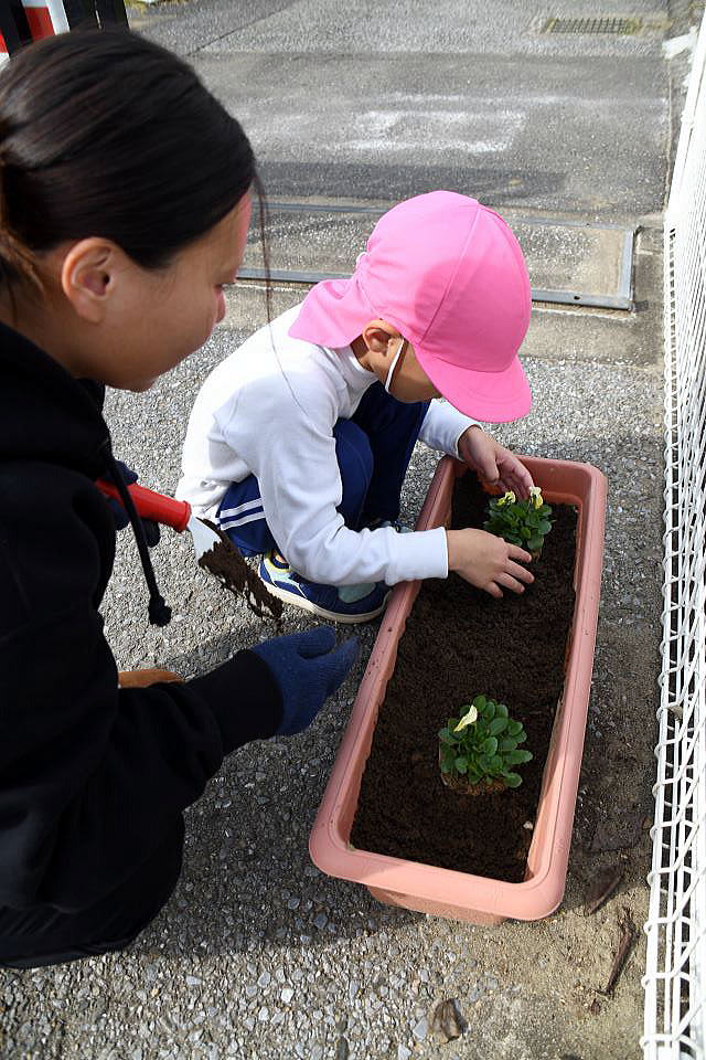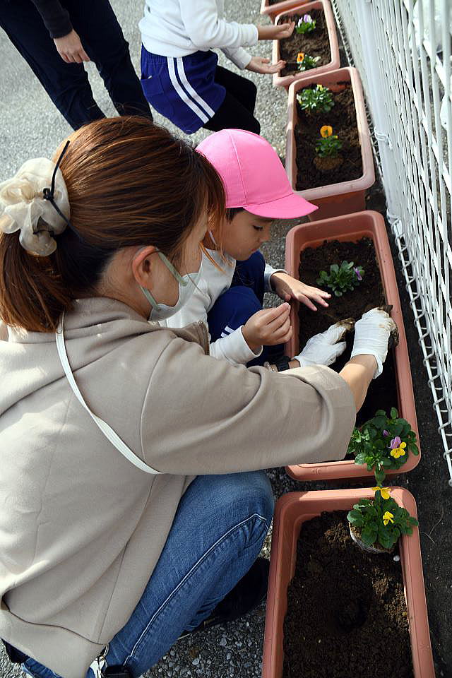 | 今日は、環境役員さんと一緒にプランターに花植えです。 「なんていうお花なの?」「ビオラっていう名前だよ」 |
