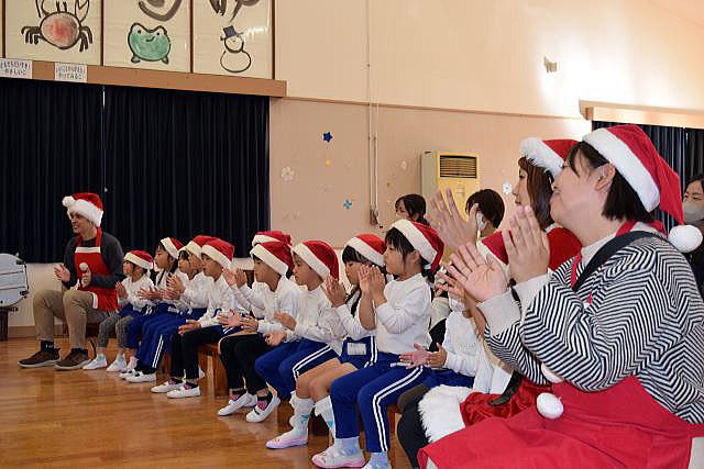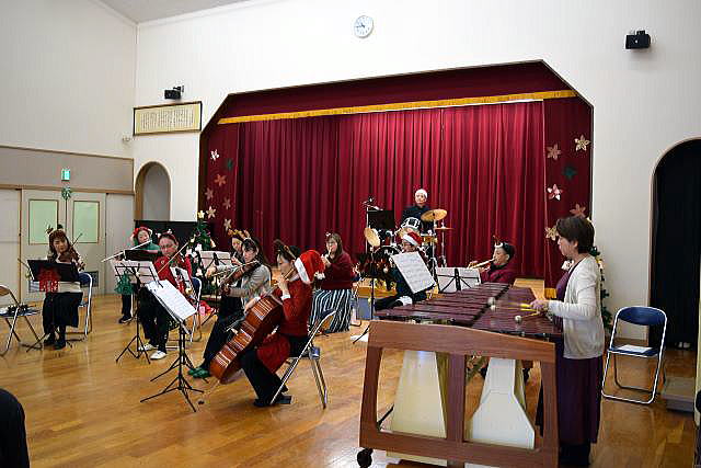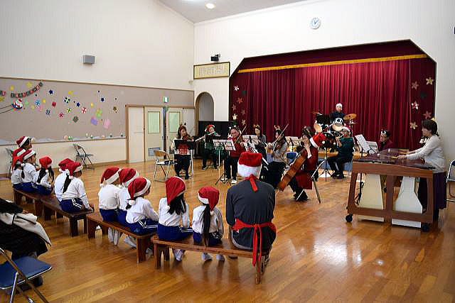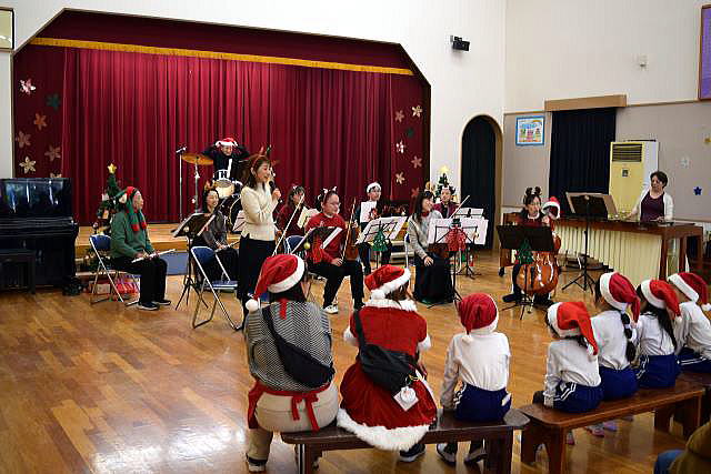 | 袖ケ浦交響楽団の皆さんによる音楽会からスタートです。 皆さんクリスマスの可愛いカチューシャを付けてきてくれました! あれれ??? 子ども達はみんなサンタさんの帽子を被っていますね♪ 前から見ても、後ろから見ても、可愛いぃ~♡♡♡ |