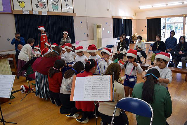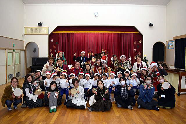 | 生演奏ならではの音の広がりや楽器の響きを全身で感じ、 子ども達は目を輝かせて聴き入っていました。 知っている曲が多く、口ずさんだり、リズムに合わせて体を揺らしたり、 「あわてんぼうのサンタクロース」では子ども達も一緒に楽器を持って共演♪ とても楽しい時間となりました。 参加してくださった保護者の皆さん、いかがでしたか? 袖ケ浦交響楽団の皆さん、ありがとうございました。 |