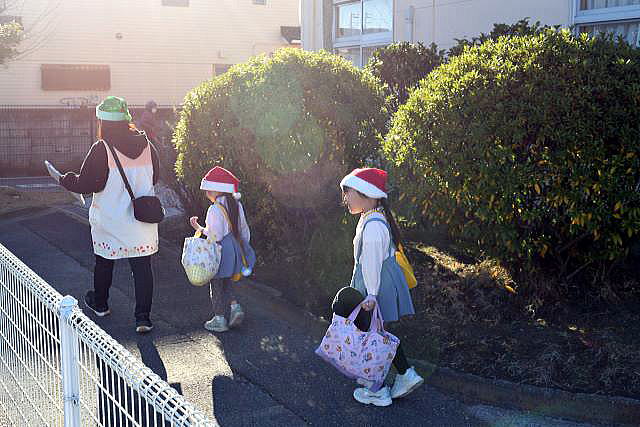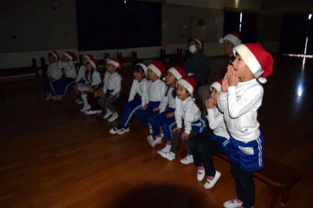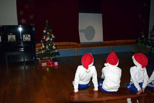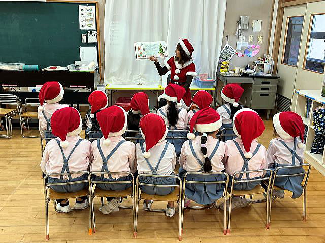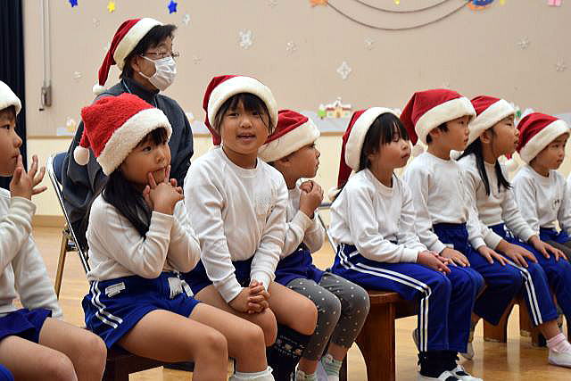 | 帰りの会の様子。 なんて可愛い後ろ姿なんでしょう・・・ もう今日はこのまま帰ります! サンタ帽子は幼稚園からのサプライズプレゼント。 「えー?このまま帰っていいの!?」子ども達も大喜びでした。 |