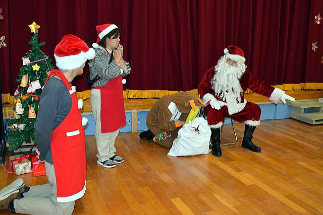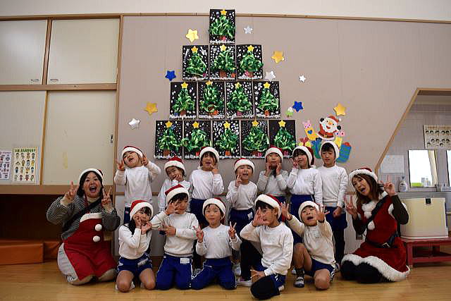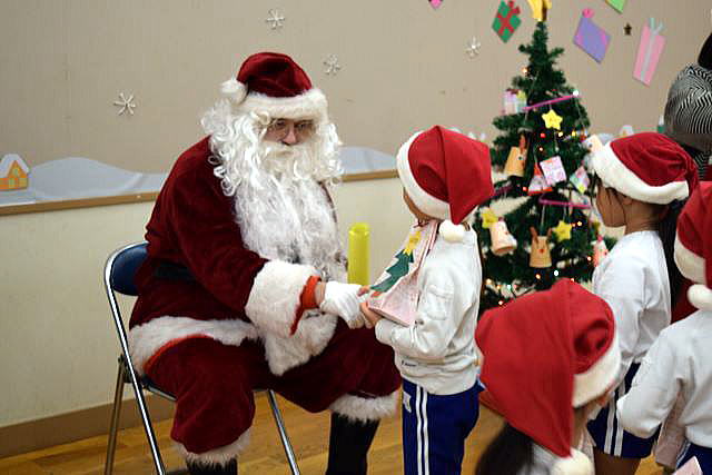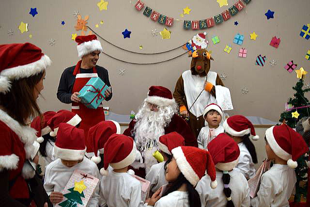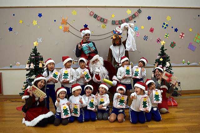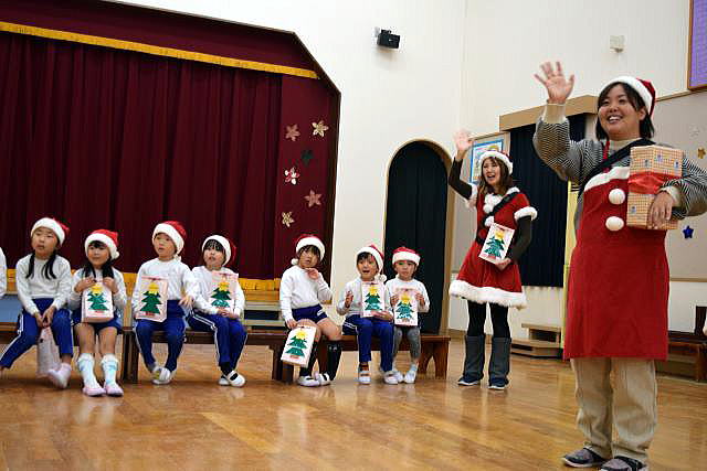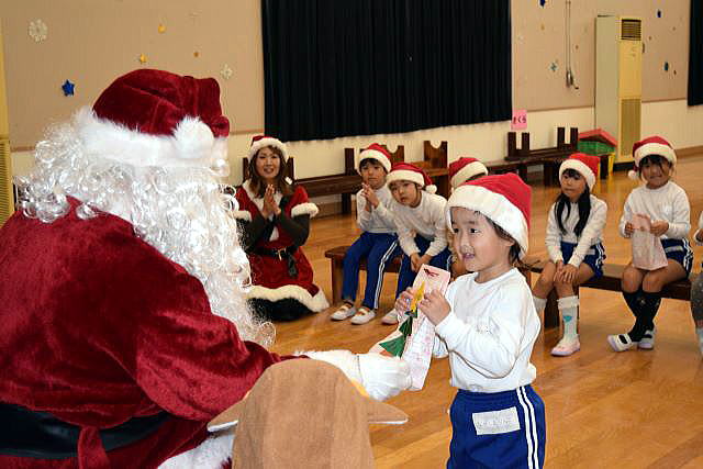 | 一人ひとりに手渡しでプレゼントまで! みんな笑顔で 「Thank you」 が言えました。 最後にみんな記念撮影をして、サンタさんは次の幼稚園に向かいました。 「サンタさーん、ありがとー!!!」 |