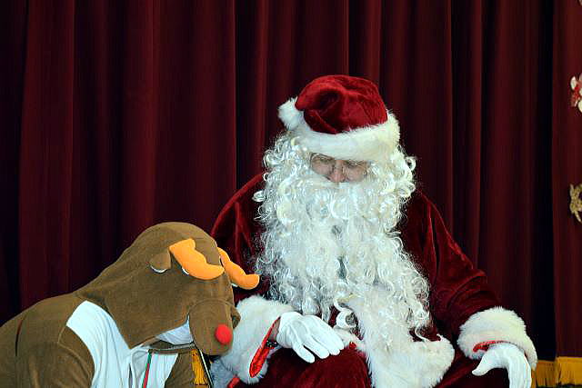 | シルエットクイズの最後にサンタさんが・・・ 背の高い(?)トナカイさんが連れてきてくれました。 子ども達も大歓声!!! 質問コーナーでは子ども達の手が止まりません。 「はい!」「はいはい!」 みんなサンタさんに興味津々の様子でした。 |