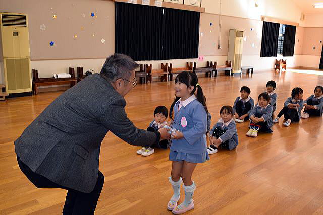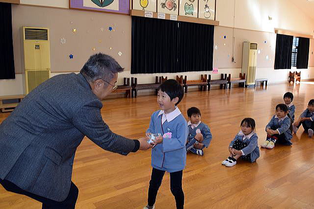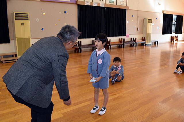 | ひとりずつ園長先生から手渡し。 「がんばってね」「はーい!がんばります」 |