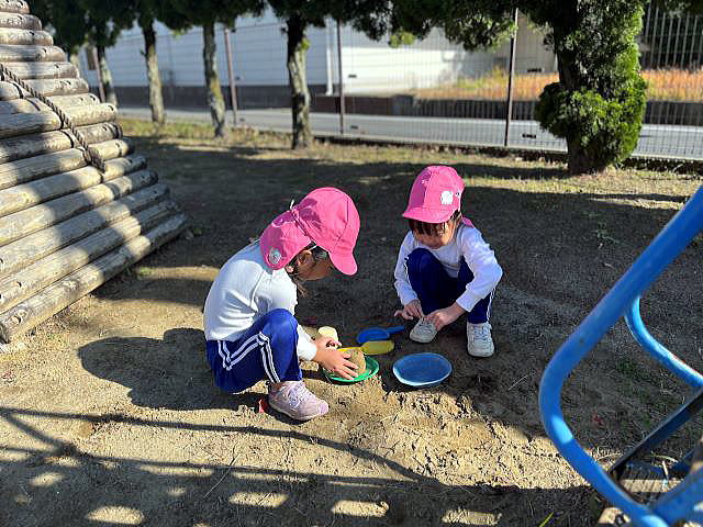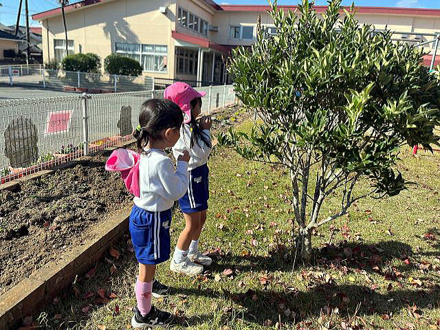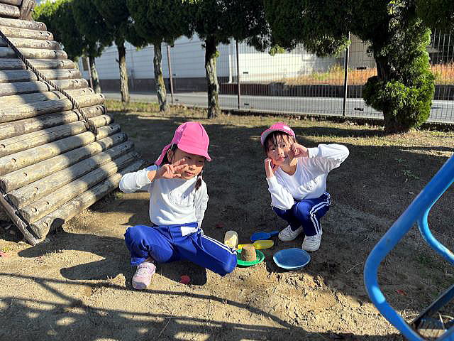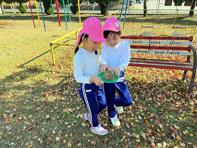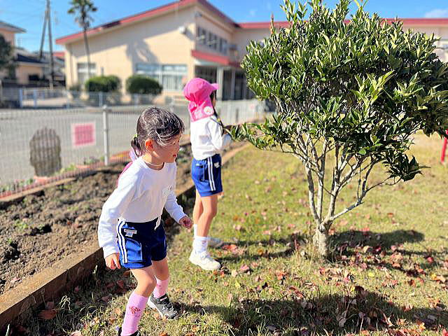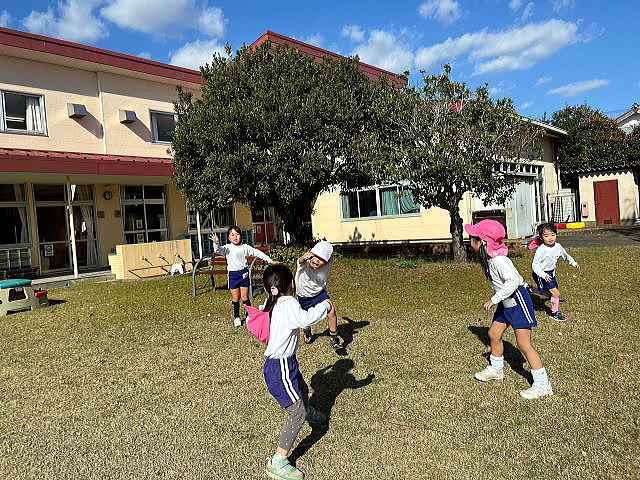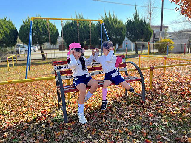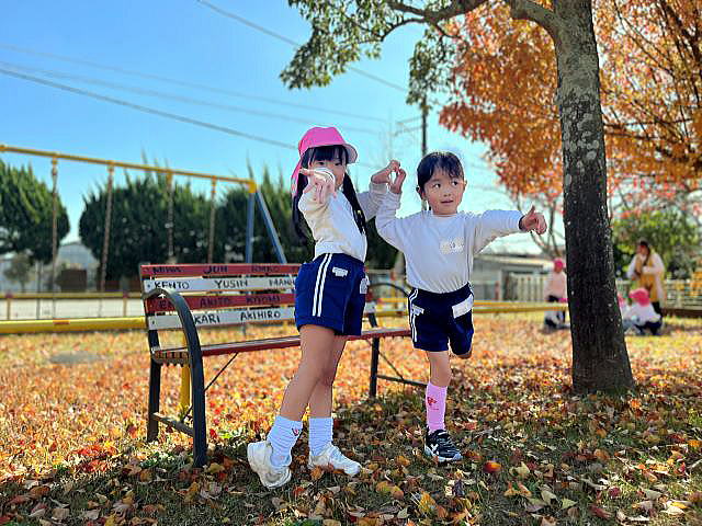 友だちと誘い合って、色々な集団遊びや、自然を取り入れた遊び。 12月だというのに、走り回れば額に汗がにじむくらいの陽気。 時折吹く、ひんやりとした風が気持ちいいくらいです。 遊んでいても、カメラを向けるとポーズ! 可愛い子ども達です。 |