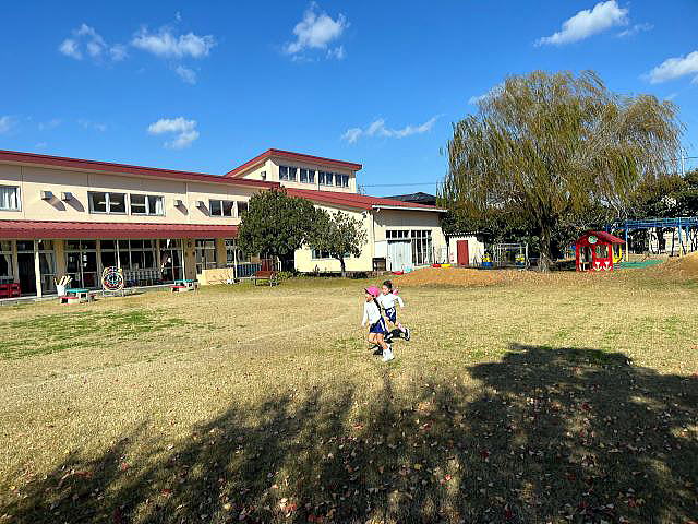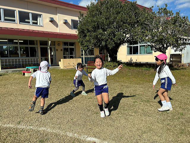 | 5歳児の秋。 運動会を経験し、体力もつき、運動量も増えてきた子ども達! 気持ちのよい秋晴れのもと、広い芝生の園庭で元気いっぱい遊んでいます。 |