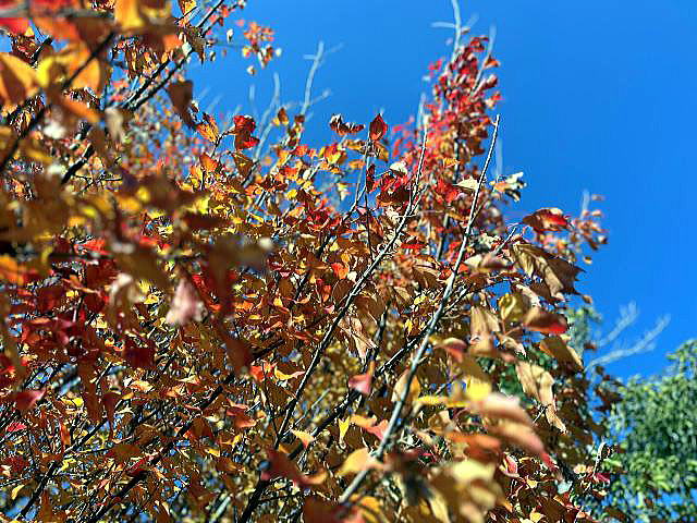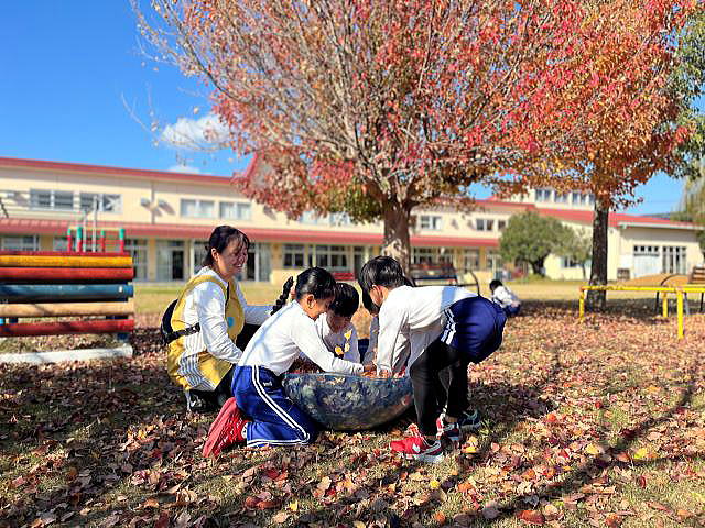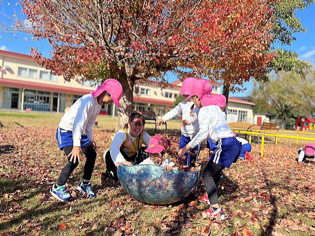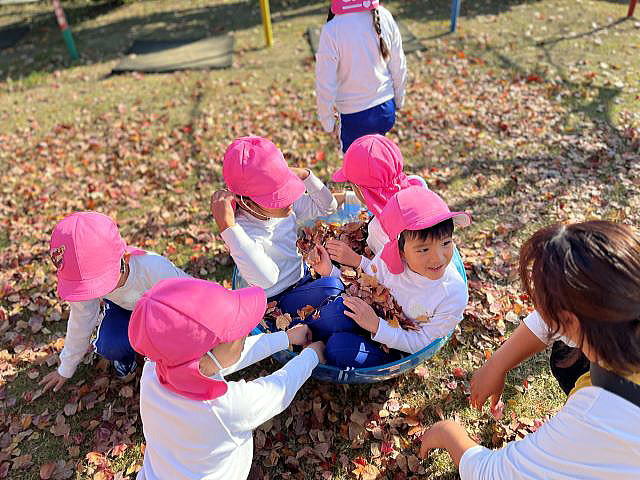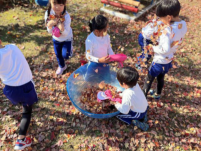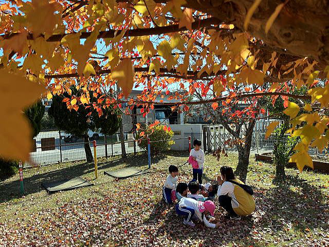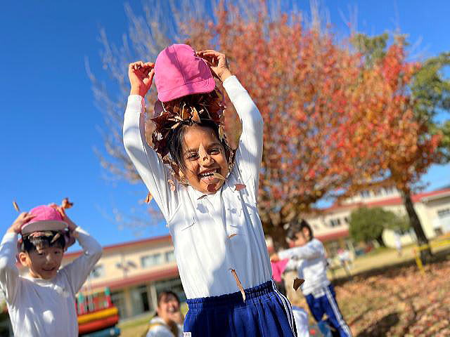 | 見上げると、どこまでも突き抜ける透き通った青い空に、 赤や黄色の葉が、ゆっくりと風に揺れています。 地面は落ち葉のカーペット。 みんな必死にかき集めてそれぞれの遊び方で楽しみます。 |