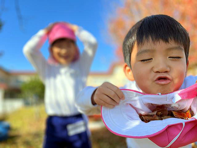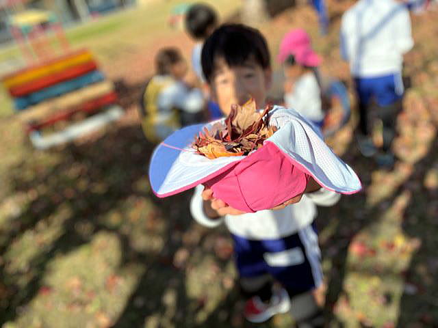 | 両手で抱えきれないと、帽子に入れて集め始めました。。 大人にとっては当たり前のことでも、子どもにとっては、そのひとつひとつが 「気づき」や「学び」のひとつとなり、それが積み重なっています。 子ども達は遊びの天才ですね!!! あぁ、この時間がずっと続けばいいのに、っと思うほど ほんわか穏やかな、幸せな空間でした。 |