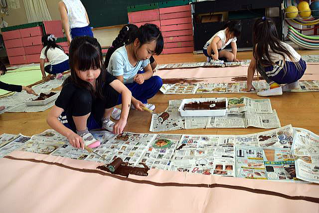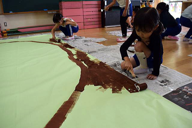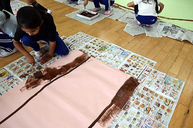 | お話が決まったら、みんなで大道具作りだ! 壁面になる絵を色塗りします。 大きい紙をローラーですいすいと塗ります♪ |