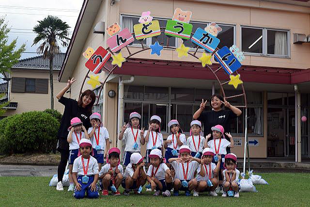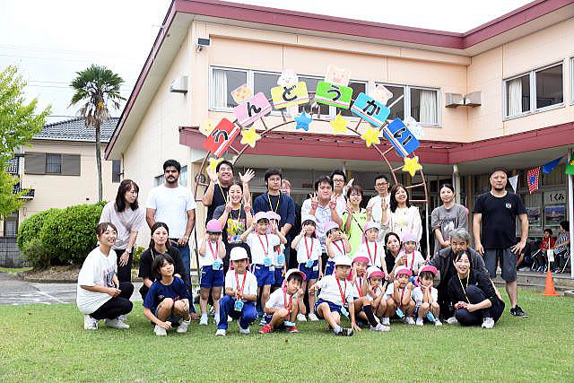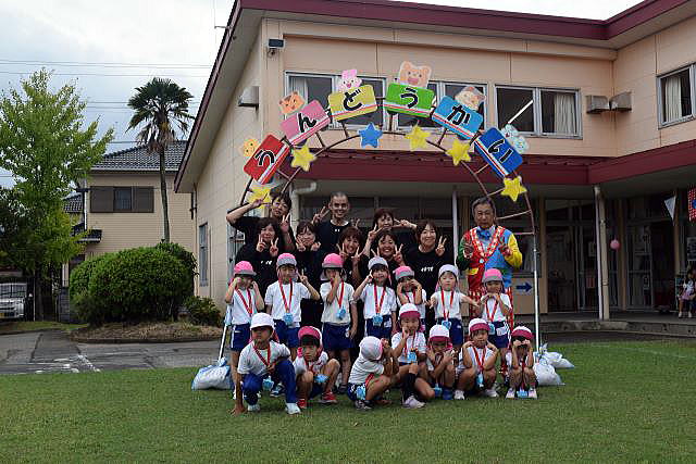 最後にみんなで集合写真。 せんせい達や保護者の皆さんも入って、何枚も撮りました。 子ども達は笑顔のキープにお疲れの様子でした、、、 |