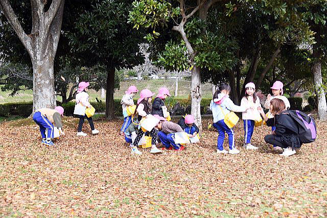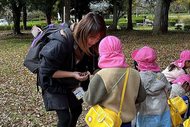 | ちゅうりっぷの球根植えのあとに、公園内を散策 色んな形や大きさのどんぐりがたくさん落ちていました。 落ち葉の上を歩く音は、カサカサ、サクサク、 そしてフワフワと不思議な感じ。 目で、耳で、手で、、、自然の中で五感が刺激されます。 |