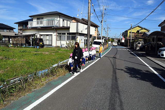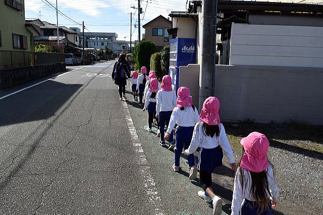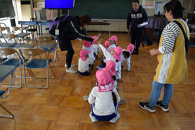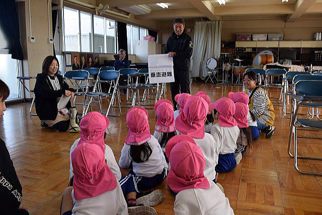 お散歩ではありません。素早く小学校の3階音楽室まで避難します。