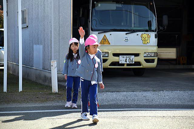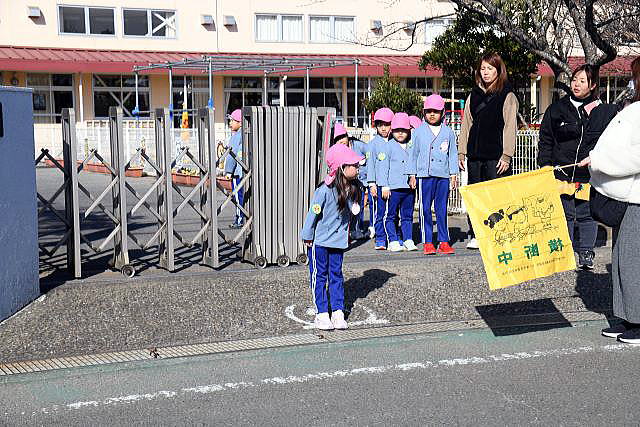 | 春からは小学生です。 道路の歩き方、横断歩道の渡り方など、しっかりお勉強です。 今日は中川小学校まで歩く練習です。 |