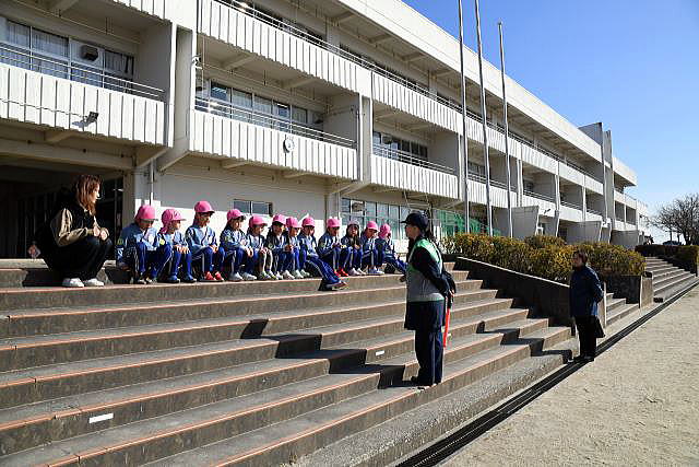 | 中川小学校に到着しました。 木更津警察署の生活安全課から来てくれた婦人警官の方から、 道路を歩くときに気を付けることを教わりました。 |