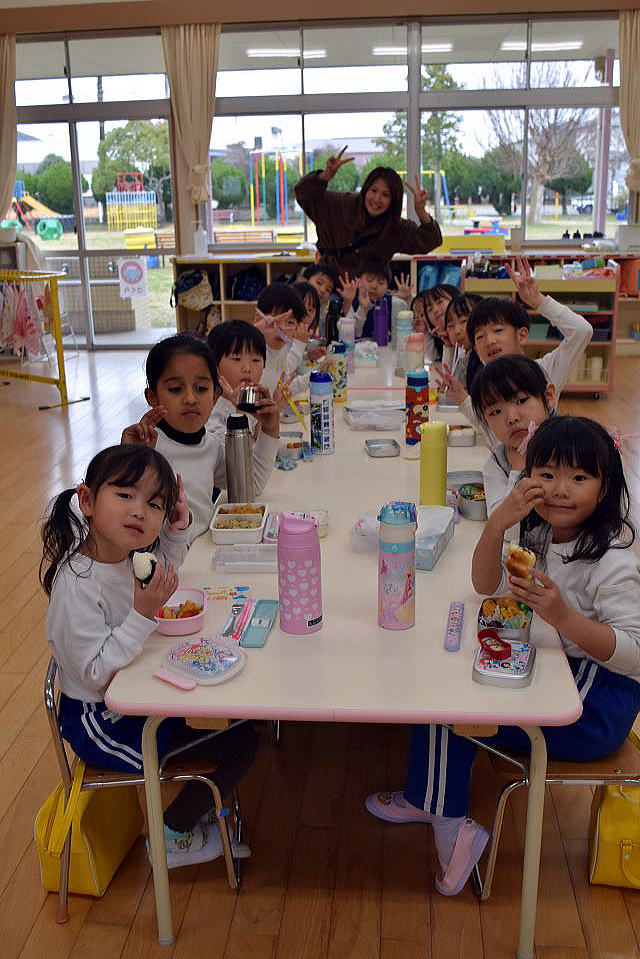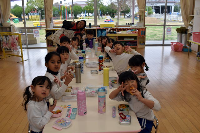 午後も元気いっぱい遊んでね。 「ドッジボールやろうよ」 「中あてがいいな」 「ハンターごっこやりたい!」 「みなさんご一緒に、ごちそうさまでした」 |