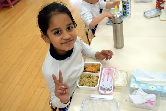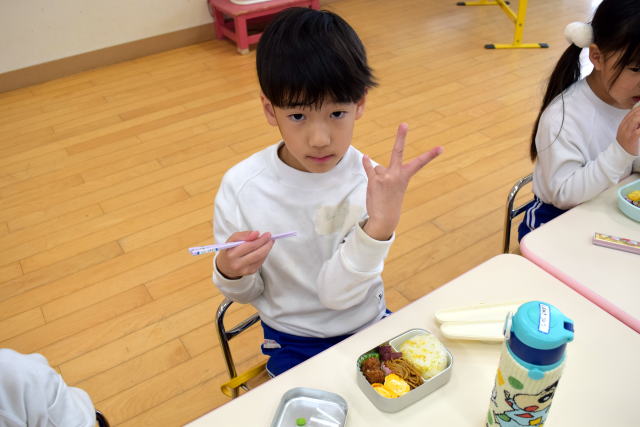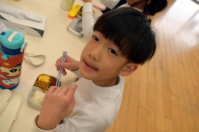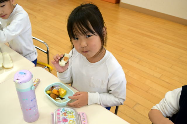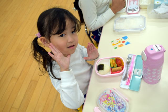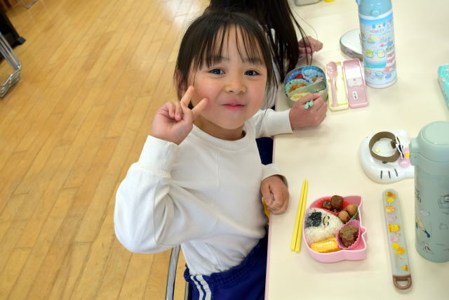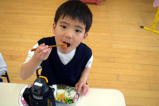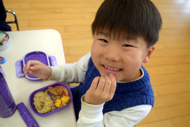 | 朝からいっぱい遊んでお腹はペコペコ。 お父さん、お母さんが作ってくれたお弁当は最高! 美味しく食べてパワーチャージです♪ |