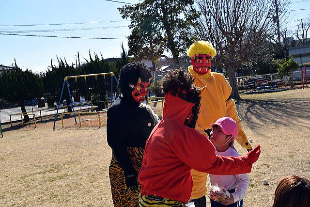 | 3体の鬼は子ども達の勢いに負け、ついに降参。 仲直りの印にお土産をくれました。 |