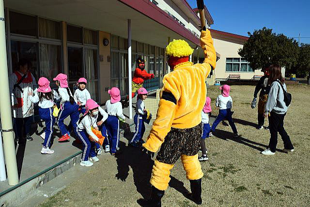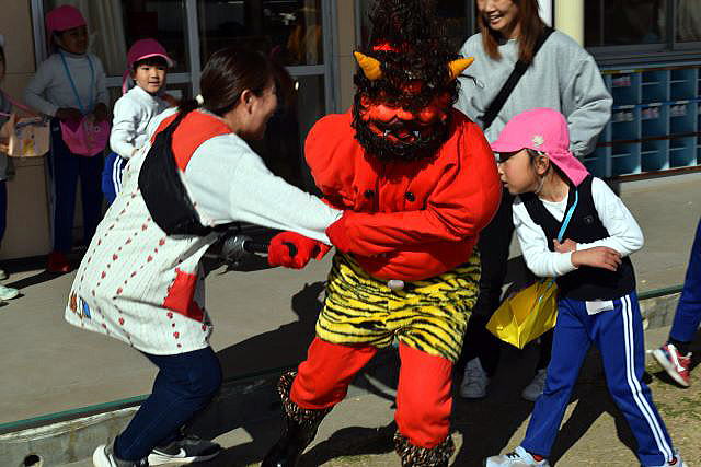 | 今年も助けに来てくれたマメマンは、なんと骨折していました・・・ 友だちのパンダさんはちょっぴり気が弱くて・・・ 先生たちまで捕まっちゃうし・・・ 今年は自分たちの力で鬼をやっつけました!!! これでお腹の中の鬼は退治できたね。 やったね!!! |