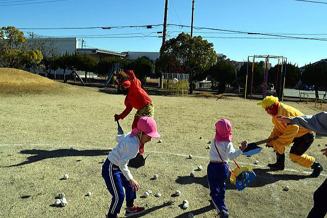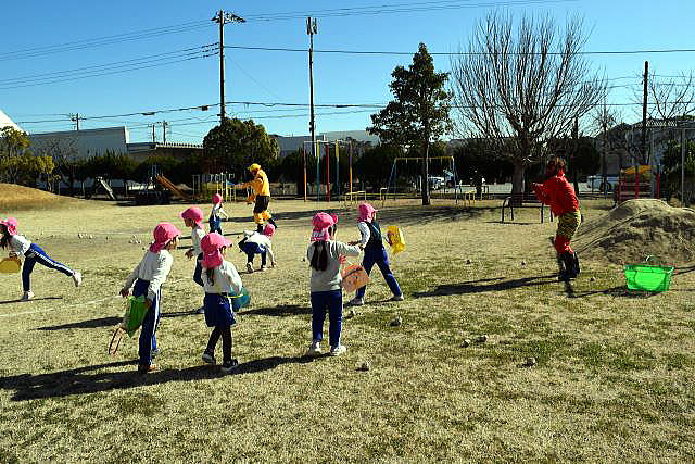 | 外で遊ぼうと出てみたら、あっちからこっちから、 鬼が!!!3体も!!! みんな豆まきだ! |